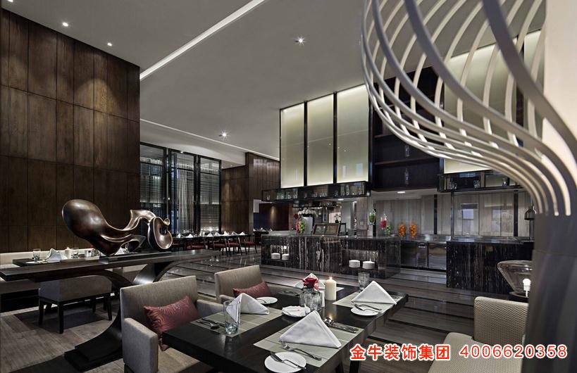 餐厅的氛围很容易受到灯光的辅助影响,选择款式可以按自己的风格选取确定,大小与空间比例的协调,餐具、餐桌、餐椅、餐布的组合等都会受到灯光营造的氛围共同呈现给客户群体。太强的光度会受刺激,太暗的环境会影响日常行为。吧台、酒柜和天花板的灯光都是整体设计的要点和兼顾空间统一风格的作用。暗沉的颜色只会弱化人的食欲,灯光要柔和不刺眼。突出层次感做好顶部的聚光作用,设计一些局部吊顶造型。