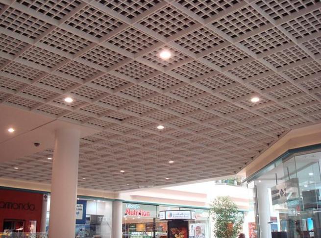 天花板的照明,要配合商场整体照明系统,可以用吊灯或者外露灯具装饰,使商场整体空间显得明亮。天花板的选材要性价比高,还要有防火、消音等特性,可根据具体情况进行选择。