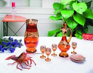 多彩水晶玻璃――通过复杂的描金、印金、玻璃釉彩、车刻蒙砂、喷砂等综合加工工艺制成,成品呈现出绚烂的玫红、鹅黄、浅紫、咖啡棕等自然色泽,艳丽夺目,美不胜收。如酒具水具等。