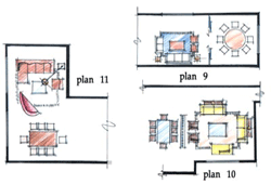 这种也是属于非常传统的搭配方式,组合方案很多,可以依据客厅里的实际环境而定,常见的组合方式就是如图中所示,形式对称,便于人们之间相互交流,平稳而不失活泼,比较适合于进深较大的房间。