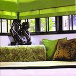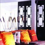 白色的墙衬托着黑色的地板,极好的、现代感的油漆透出清新和对比。 沙发 上明亮的装饰品和垫子,如 沙发 (实际是两张单人床)上橙色的印度垫子,充满了整个房屋。再加上起居室内中国锦缎做成的垫子,主人房墨绿色的床罩,餐桌上四四方方垂着的亮红色的吊穗。同样运用颜色影响儿童房,印有流行的现代图案的蓝色垫子,悬挂着的一串串水晶珠子,给人浓郁的艺术氛围。