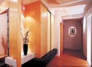 餐厅与客厅中间的走道通往各房间。走道的左侧是一处精心设计的装饰台,主人在此处放置了漂亮的花瓶,在顶端的投 射灯 光环围绕下更显精致。旁边是挑空到顶的移门置物柜。走道尽头,借由间接的光影透析,勾勒出端景之效果。