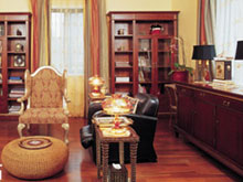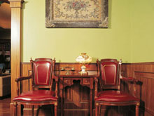 如果说在家具的选择上胡小姐基本是保守的,那么在色彩的运用上,胡小姐就现代得多了。她喜欢现代明快的色彩,用色非常大胆。一楼绿色的墙壁与欧式家具相衬,很有 油画 效果。小书房用了宝蓝色,很浓烈,小餐厅则是水红的基调,很艳丽。二楼三楼的卧房用了柠檬黄色,温馨雅致。