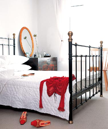 黑色铁架床和纯白的床罩搭配散发英式风格。床头用旧画箱来做床头柜,可以收纳冬天的被褥。床,1980元。宜家家居。画箱,600元/潘家园。