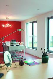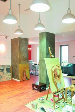 在“存旧求新”的同时,主人并没有忽略了颜色运用这一环。用色简单,却是经过了慎重的选择:以浅白色的仿石材瓷砖作为客厅地板,公共空间四白落地,灰白色予人朴实无华、贴近大自然的感觉,这种毫无修饰的“粗”,让人感到无比亲切置身这样的环境,主人与访客之间的距离,无形中也拉近不少。但是需要激情灵感迸发的画室,却有一面浓得不能再浓的红墙。