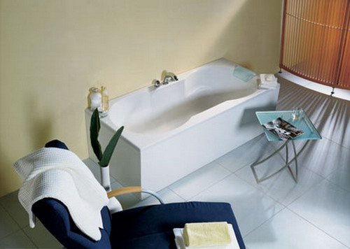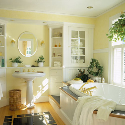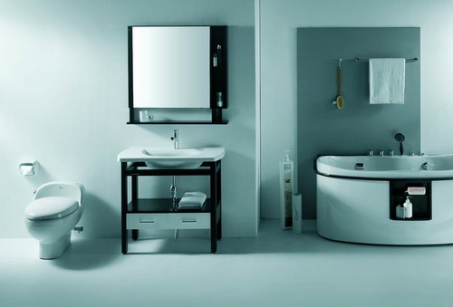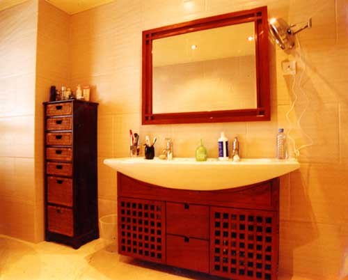 这浴室已有两个储物墙柜,配上简洁的柱式 洗手盆 极为适合。墙柜上部装玻璃门,增加了通透感,侧面向 洗手盆 斜开,既避免了方正呆板的形状,又能在 洗手盆 前顺畅地使用抽屉。