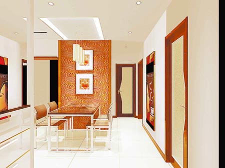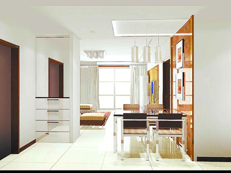 条纹的广泛运用让平淡的画面多了些调皮的因素。热爱生活的人,总是在不经意间增添一些不寻常的小把戏。小趣味也让我们怦然心动。 沙发 、地毯、装饰墙、壁纸,搭配得恰到好处而又不让人感觉过多的花哨。玻璃与金属的巧妙显现,在山回路转间流金溢彩。传统灰色雍容华贵,就好像内敛优雅的中国服饰旗袍一样,领间袖口的金色滚边处理,虽然只是轻微几笔,就让意境大不一样。脱离尘世喧嚣的冷静在这一刻增添了好多浑然天成的灵气。进门整理柜上正面的大镜子,折射了室内的每景每物,空间随之也宽敞了很多。迎面而来的装饰墙简单的挂上两幅温暖的画面,配合侧面的巧克力色调的挂画,夹杂着满室的温馨,仿佛浓浓的咖啡香气,脑海里剩下的只是幸福美好的生活。家具的简约风格同样是这个居室的一大特点,光是 沙发 、餐桌椅就可圈可点。硬质的剪裁显示出主人的干练和豁达,而线点流畅的餐厅物件更加利落。别具一格的巧妙搭配让平白无奇的生活泛起了一些涟漪。