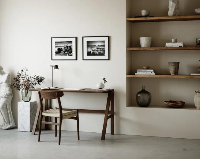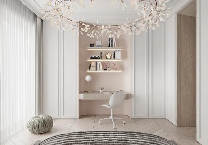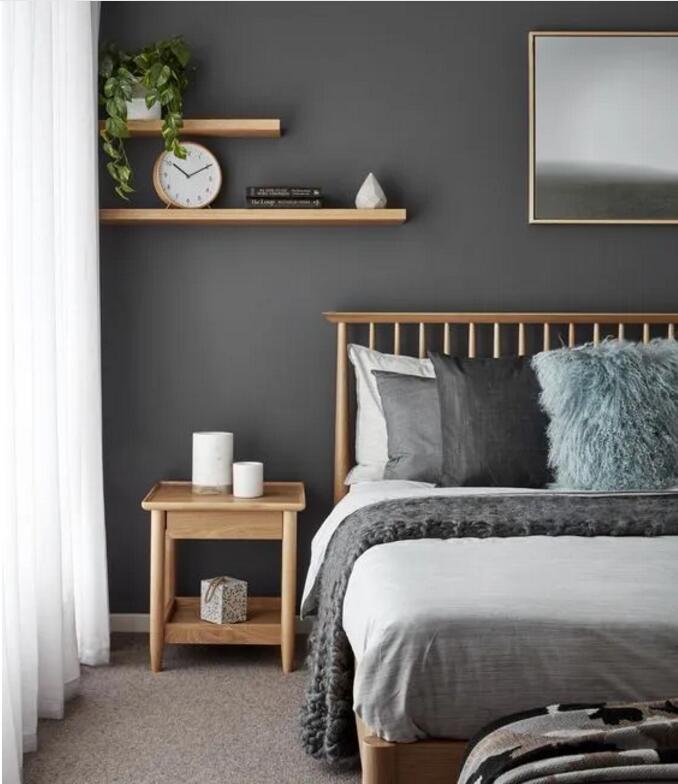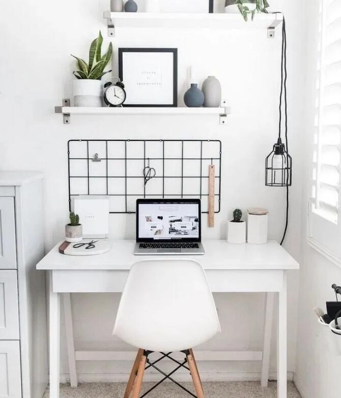 卧室悬挂桌上方设置隔板,增加存储空间,看起来更加美观整洁。