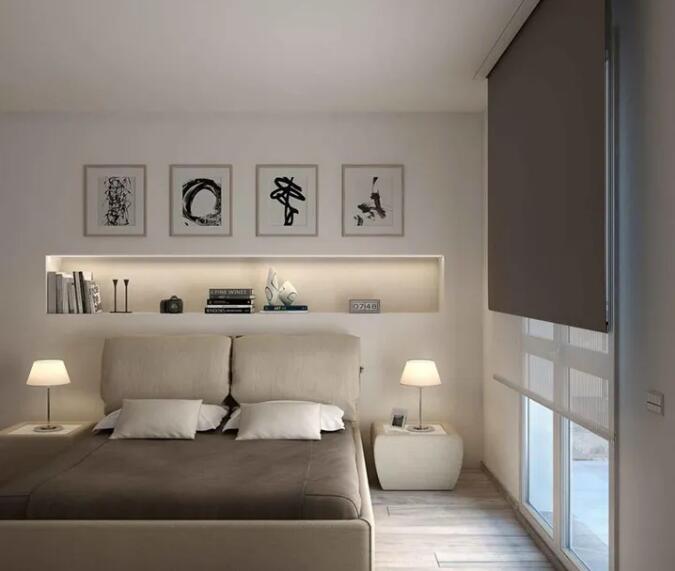 睡前看的书都可以放在壁龛上。如果床的宽度比壁龛窄,建议配备床头柜,看起来更和谐。