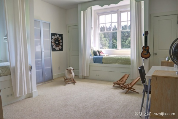 2.一般的凸窗大多长约两米,宽近一米,所以许多小家庭的主人在凸窗台上提出了一个想法:把凸窗空间设计成一张小单人床!大多数凸窗都是三面照明,所以罗马窗帘和普通的垂直窗帘可以很好地用来分隔空间。更美妙的是,在一个充满星星的夜晚,打开三面玻璃的窗帘,就像一张躺在空中的小床,夜空像水一样干净。