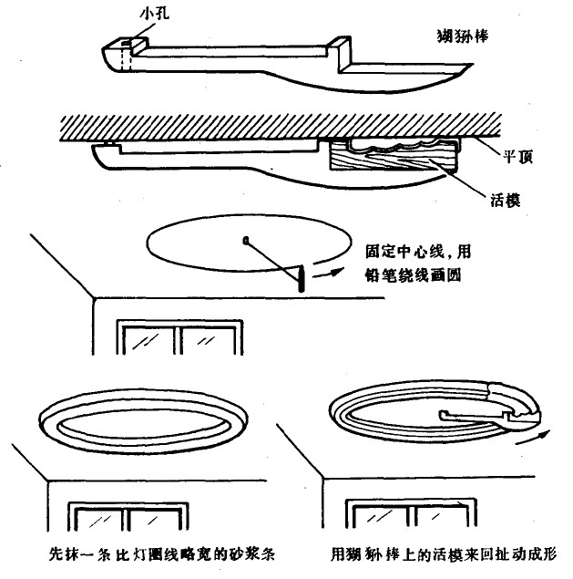 ⑤绕着中心用猢狲棒上的活模来回扯动,使砂浆成型。扯制罩面层的方法同上,扯制完成后取下猢狲棒,用铁皮修理灯圈线的内外口与平顶交接处,方法同装饰线。
