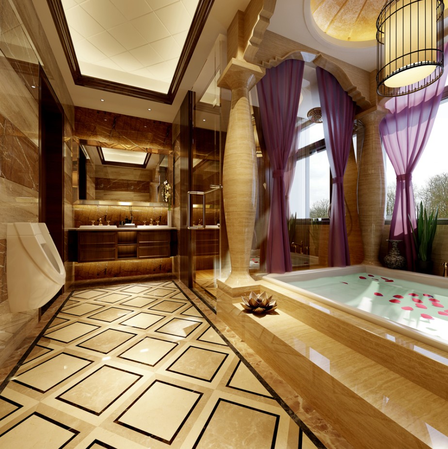 卫生间和浴室有较强的绿化效果。因为卫生间和浴室的四周墙壁多用白色瓷砖,有绿色植物的反衬,更显得夺目流彩。