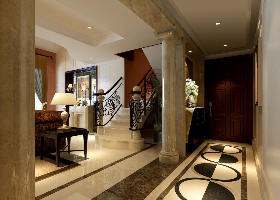采用密度板做适宜的浮雕,与墙面上的小型浮雕工艺品呼应起来.使门厅的装饰有一种共同语言,产生气氛上的烘托效应,以形成门厅的特色。