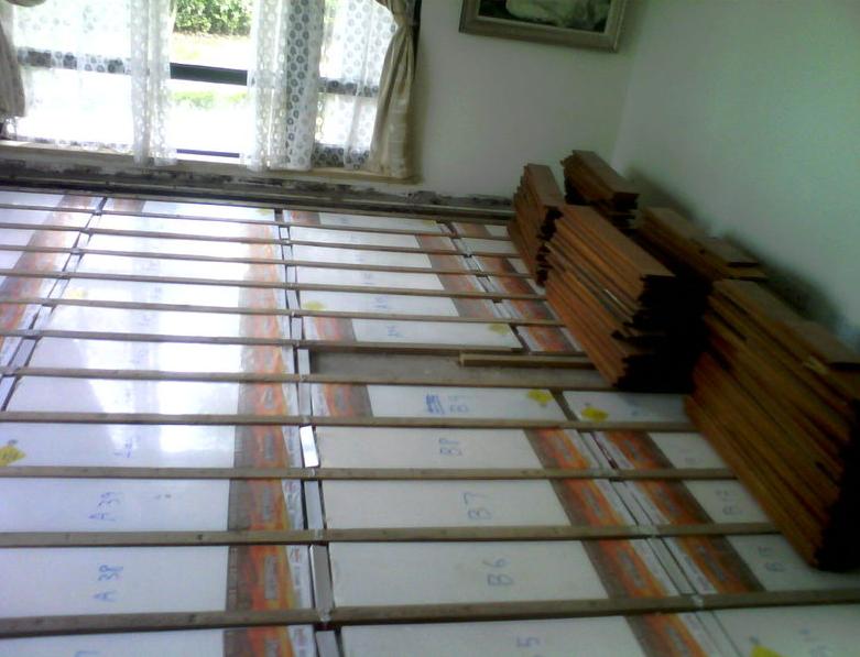 3、铺龙骨时要看线管处的做法,一定要是过桥式(我也是半瓶水,借胆晃晃罢了。在我的理解就是龙骨上向下的那面要挖个凹口,这个凹口是为了可以让线管穿过去。至于是不是叫“过桥式”这个名字,我也记不清了)。